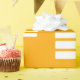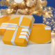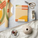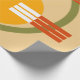 This wrapping paper has a mid-century modern abstract design of a gold circle inside a green circle with orange and white stripes.