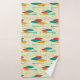 Mid-Century modern bathroom towel. Pointed oval lens shapes and eames pattern. Colours in red, turquoise, yellow and brown.