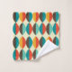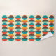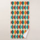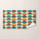 Mid-Century modern bathroom towel. Pointed oval, lens shapes pattern. Colours in red, turquoise, yellow and brown.