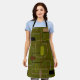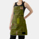 This apron has a mid-century modern design of rectangles in green, gray, brown, and black.