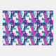 Wrapping paper in a mid-century modern-inspired design featuring two stylized cats in bold, geometric shapes of turquoise, magenta, dark blue, and white. Abstract patterns and retro shapes fill the background, giving it a fun, vintage vibe with a minimalist edge.