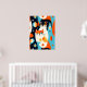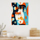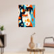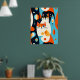 Poster in a mid-century modern-inspired design featuring two stylized cats in bold, geometric shapes of orange, teal, black, and white. Abstract patterns and retro shapes fill the background, giving it a fun, vintage vibe with a minimalist edge.