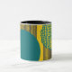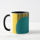 This mug has a mid-century modern design of circles with lines coming out of them in teal and black on a field of gold.