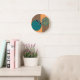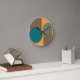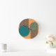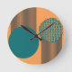 This clock has a mid-century modern design of circles with lines coming out of them in teal and black on a field of orange.