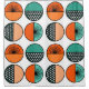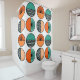 This shower curtain has a mid-century modern design of half-circles in teal and orange with half of a starburst in some and tiny repeating circles in others.