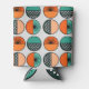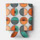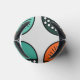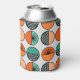 This can cooler has a mid-century modern design of half-circles in teal and orange with half of a starburst in some and tiny repeating circles in others.