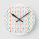 This clock has a mid-century modern design of circles strung together in retro shades of teal and orange on a field of white.