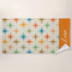 This is custom personalized beach towel featuring elegant mid century modern colourful atomic starburst pattern in different vibrant retro colours.