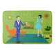 This Mid Century Modern Couple Bath Mat looks like a scene out of a romantic comedy. The 1960's style, minimalist art design features an attractive cartoon couple enjoying a romantic evening at home. The sophisticated room prominently features a green stone wall with a roaring fire in the fireplace. The furnishings in the room include an orange, lounge chair with matching footstool, a red, starburst wall clock, a yellow, sputnik light fixture, and an orange side table, which is home to a green, portable record player. On the floor beside the end table, a vinyl record can be seen poking out of a kitschy album cover. In the centre of the green flooring, there is a large, rectangular, teal rug. In the middle of the scene, we have a very sophisticated couple. There is a suave man in a royal blue suit, white shirt and blue bow tie. The tall, dark and handsome man is gazing at his lovely companion. The elegant, raven haired woman is wearing a flouncy aqua dress. They are each holding a crystal martini glass with a floating olive. Cheers! Here's to the perfect evening at home!