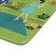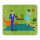 This Mid Century Modern Couple Cutting Board looks like a scene out of a romantic comedy. The 1960's style, minimalist art design features an attractive cartoon couple enjoying a romantic evening at home. The sophisticated room prominently features a green stone wall with a roaring fire in the fireplace. The furnishings in the room include an orange, lounge chair with matching footstool, a red, starburst wall clock, a yellow, sputnik light fixture, and an orange side table, which is home to a green, portable record player. On the floor beside the end table, a vinyl record can be seen poking out of a kitschy album cover. In the centre of the green flooring, there is a large, rectangular, teal rug. In the middle of the scene, we have a very sophisticated couple. There is a suave man in a royal blue suit, white shirt and blue bow tie. The tall, dark and handsome man is gazing at his lovely companion. The elegant, raven haired woman is wearing a flouncy aqua dress. They are each holding a crystal martini glass with a floating olive. Cheers! Here's to the perfect evening at home!