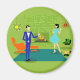 This Mid Century Modern Couple Magnet looks like a scene out of a romantic comedy. The 1960's style, minimalist art design features an attractive cartoon couple enjoying a romantic evening at home. The sophisticated room prominently features a green stone wall with a roaring fire in the fireplace. The furnishings in the room include an orange, lounge chair with matching footstool, a red, starburst wall clock, a yellow, sputnik light fixture, and an orange side table, which is home to a green, portable record player. On the floor beside the end table, a vinyl record can be seen poking out of a kitschy album cover. In the centre of the green flooring, there is a large, rectangular, teal rug. In the middle of the scene, we have a very sophisticated couple. There is a suave man in a royal blue suit, white shirt and blue bow tie. The tall, dark and handsome man is gazing at his lovely companion. The elegant, raven haired woman is wearing a flouncy aqua dress. They are each holding a crystal martini glass with a floating olive. Cheers! Here's to the perfect evening at home!