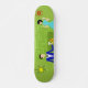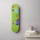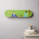 This Mid Century Modern Couple Skateboard looks like a scene out of a romantic comedy. The 1960's style, minimalist art design features an attractive cartoon couple enjoying a romantic evening at home. The sophisticated room prominently features a green stone wall with a roaring fire in the fireplace. The furnishings in the room include an orange, lounge chair with matching footstool, a red, starburst wall clock, a yellow, sputnik light fixture, and an orange side table, which is home to a green, portable record player. On the floor beside the end table, a vinyl record can be seen poking out of a kitschy album cover. In the centre of the green flooring, there is a large, rectangular, teal rug. In the middle of the scene, we have a very sophisticated couple. There is a suave man in a royal blue suit, white shirt and blue bow tie. The tall, dark and handsome man is gazing at his lovely companion. The elegant, raven haired woman is wearing a flouncy aqua dress. They are each holding a crystal martini glass with a floating olive. Cheers! Here's to the perfect evening at home!