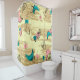 Mid-Century Modern Shower Curtain dandelion clocks in blue with brown stems and brown seeds on a white background.