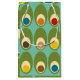 This gift bag has a mid-century modern design of green ovals with ovals and circles in them making them look like eggs in retro colors of red, yellow, blue, green, brown, and orange on a field of light blue.