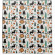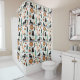 Mid Century Modern shower curtain with black cats, turquoise and orange abstract trees leaves plants.