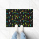 Mid-Century modern geometric abstract black doormat in colours of the time period on a black background.