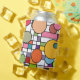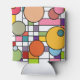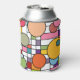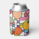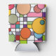 This can cooler has a mid-century modern design of a grid with some rectangles colored in and circles on top in retro colors.
