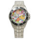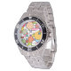 This watch has a mid-century modern design of a grid with some rectangles coloured in and circles on top in retro colours.