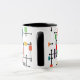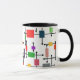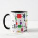 This mugs has a mid-century modern design of a large grid of horizontal and vertical black lines with colorful rectangles.