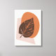 Canvas in a mid-century modern, minimalist, boho style print of a large leaf silhouette in dark coffee brown against geometric forms of rust and taupe, on a beige background