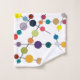 This towel set has a mid-century modern design of black lines with circles of different colours and sizes on a field of white.