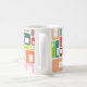This mug has a mid-century modern design of rectangles with a white hole in retro colours.