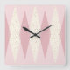 This Mid Century Modern Pink Argyle Square Acrylic Wall Clock (large print) pattern features a First Lady pink background and a pattern of mod, translucent, blush diamonds overlaying larger, vintage cream diamonds with gold coloured, space age speckles. This minimalist inspired, deconstructed argyle is a simplistic throwback of the larger than life atomic era that dominated the decorating landscape of the 1950s and 1960s. This kitschy design is reminiscent of everything from retro Palm Springs’ bowling alley signs to classic TV shows to the television trays you used at your grandma’s house.