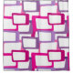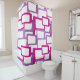 This shower curtain has a mid-century modern design of skewed rectangles with white holes in shades of pink and shades of purple.