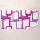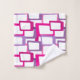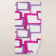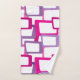 This towel set has a mid-century modern design of skewed rectangles with white holes in shades of pink and shades of purple.