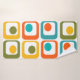 This towel set has a turquoise washcloth, a green hand towel, and a bath towel with a mid-century modern design of four rounded rectangles in four rows with ovals inside them in orange, yellow, green, and turquoise.