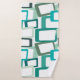 This towel set has a light sea-green washcloth, a darker sea-green hand rowel, and a bath towel with a mid-century modern design of skewed rectangles with white holes in shades of blue-green.
