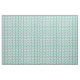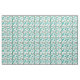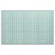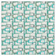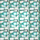 This fabric has a mid-century modern design of skewed rectangles with white holes in shades of blue-green.