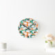 This wall clock has a mid-century modern design of skewed rectangles with white holes in shades of teal and shades of orange.