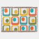 This throw blanket has a mid-century modern design of four rounded rectangles in four rows with ovals inside them in orange, yellow, green, and turquoise.