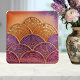 This stunning ceramic tile features a captivating Art Deco fan pattern in a vibrant mosaic of purple and orange hues. The intricate design, reminiscent of a peacock feather or a Japanese fan, is accented with metallic gold grout lines that add a touch of luxury and sophistication. Perfect for adding a unique flair to your backsplash, fireplace, or any decorative wall space, this tile brings a touch of vintage glamour and artistic elegance to your home decor. Its rich colors and detailed mosaic work create a mesmerizing visual effect that is sure to be a conversation starter.