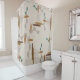 Mid-Century Modern Shower Curtain, whimsical abstract shapes, Multiple triangles, boomerangs, intersecting lines, dots and circles in colours of brown, blue, orange and green. Perfect shower curtain for any mid-century modern bathroom.