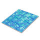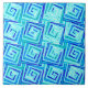 Modern abstract design of squared spirals in light aqua and shades of turquoise and cobalt blue, accented with white