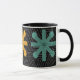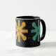 This mug has a Mid-century modern design of starbursts in retro colours on a field of black.
