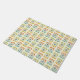 An atomic era-inspired pattern with a sputnik starbursts inside a simple geometric pattern in chartreuse, orange, yellow and blue.