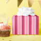 Wrapping paper in a Mid-Century Modern striped pattern in shades of medium pink, fuchsia pink, and burgundy / wine red, accented with pastel pink