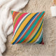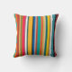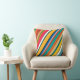 This throw pillow has a design of diagonal stripes on the front and vertical stripes on the back in Mid-Century Modern colors.