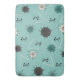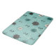 This atomic era inspired art pattern has sputnik starbursts styled lines and planet-like circles in off-white cream, brown and teal, with a turquoise background.