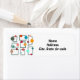 These return address labels have a Mid-century modern design of grey trapezoids with colourful circles on them.