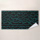 This towel set has turquoise washcloth, a black hand towel, and a bath towel with a mid-century modern design of lines with half-rectangles in turquoise on a field of black.