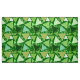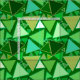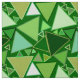 Mid-Century Modern geometric mosaic of outlined triangles in shades of emerald and jade green, aqua and beige, on an emerald green background fabric