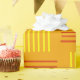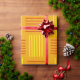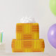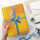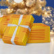 This wrapping paper has a mid-century modern design that looks like a weave with red and yellow lines on a field of gold.