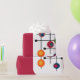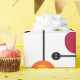 This wrapping paper has a mid-century modern design of a magenta rectangle with a white rectangle at the bottom with a black grid with retro circles on it.