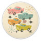 A super pattern of cars, atomic starburst and abstract shapes, inspired by retro mid-century designs in pastel tones.