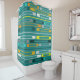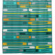 A midmod 1950s vintage style art design has simple geometric shapes of wide rectangles. Multicolored colourful teal green along with orange, yellow and grey.