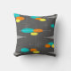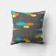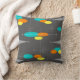 Mid-Century Modern Pillow in space age spheres and triangles with intersecting lines. Bright blue, orange and yellow on a dark grey background.